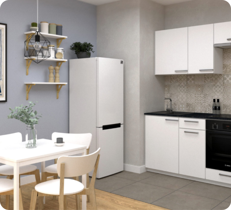 Dlatego w Pakiecie INWESTYCYJNYM przewidziano wyposażenie łazienki z meblami i pralką, oświetlenie we wszystkich pomieszczeniach, podstawowy moduł kuchenny ze sprzętami AGD. W cenie pakietu uwzględniono również meble gotowe do salonu