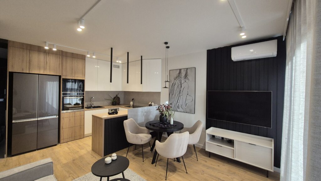 - W nowoczesnych aranżacjach świetnym rozwiązaniem jest połączenie obu materiałów – np. płytki w strefie roboczej kuchni i panele w części jadalnej i salonie.
