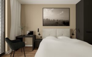 W wykańczanym mieszkaniu w inwestycji Acatom – Piastowska nie zapomniano o wszystkich elementach, które czyniłoby to wnętrze gotowym do zamieszkania. Co więcej, w sypialni znalazło się miejsce na biurko do pracy zdalnej wykonane przez stolarza, natomiast łazienka kultywuje minimalistyczny czarno-biały charakter, spotykany w kuchni. Warto zauważyć obecność coraz popularniejszych żaluzji drewnianych, które ocieplają wnętrze, nadając bardziej klasycznego wyglądu.