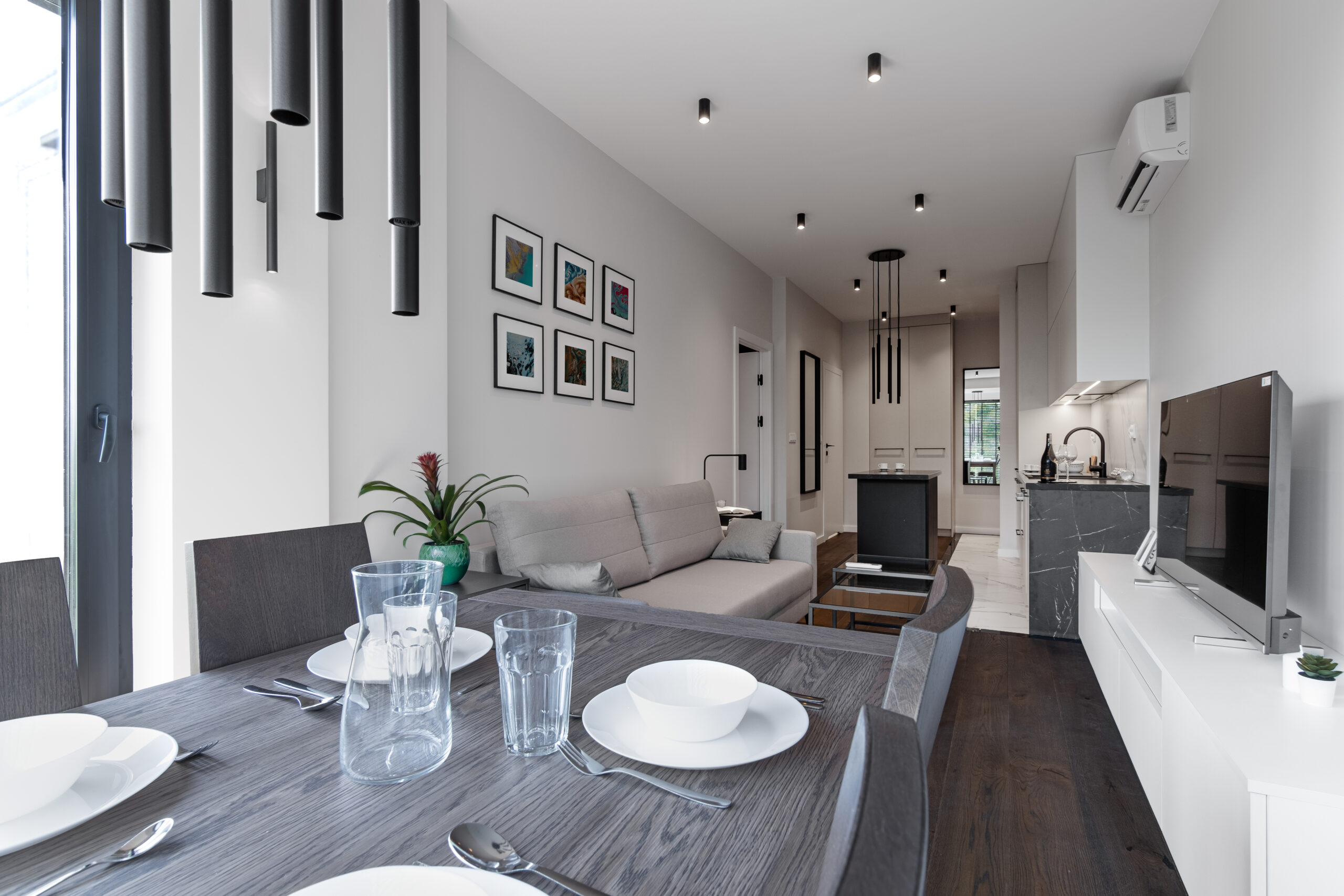 Ponadczasowe połączenie bieli z czernią, kompleksowe wykończenie z pełnym wyposażeniem i dekoracjami. Piękne wnętrze gotowe do zamieszkania – tym jest właśnie standard “wchodzisz i mieszkasz”