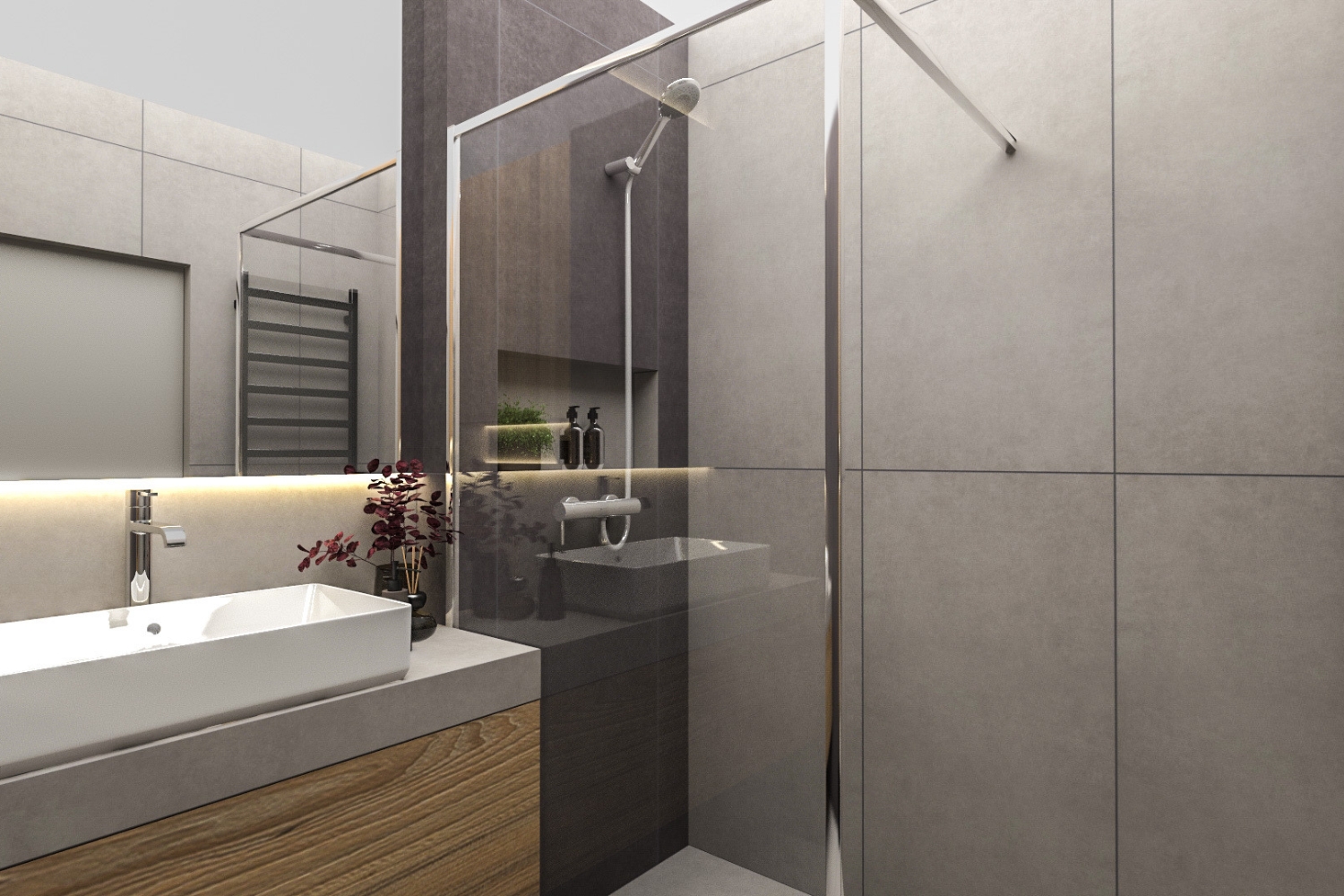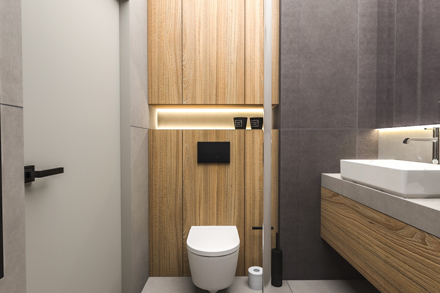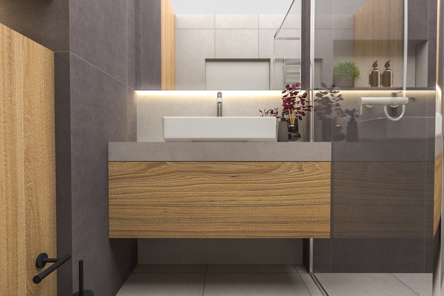 Projekt łazienki zakładał odniesienie do motywu przewodniego, który obecny jest w całym mieszkaniu. Dlatego ponownie spotykamy tutaj szarość z drewnem, uzupełnioną o efektywne podświetlenia LEDowe. Całość prezentuje się estetycznie i ponadczasowo.