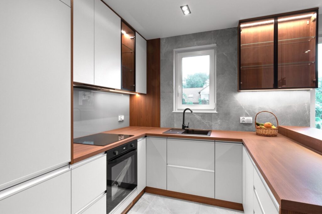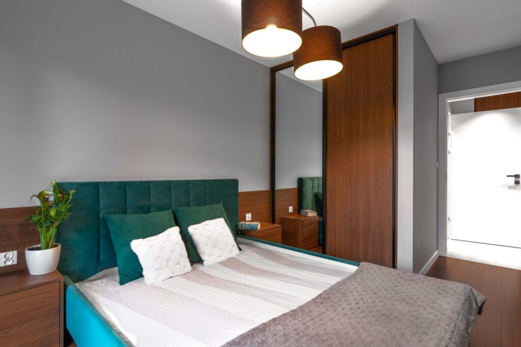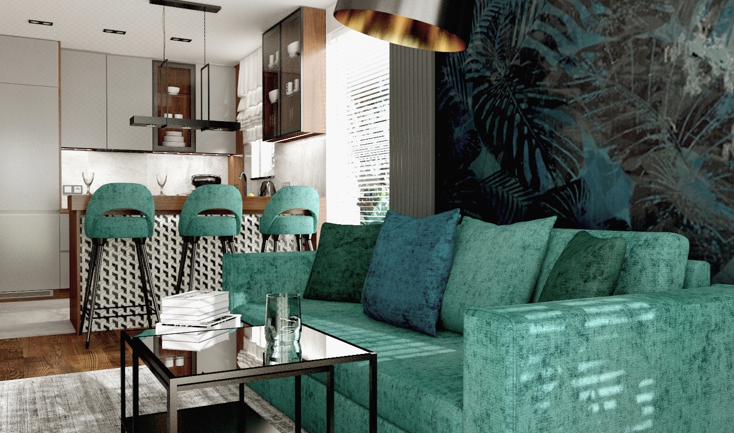 Zaprojektowane i wykończone pod klucz mieszkanie łączy nowoczesność z nutą eklektyzmu. Motywem przewodnim jest drewno i szarość, które zaakcentowano turkusowymi elementami wystroju. Stonowana i ciepła paleta kolorystyczna sprawia, że zaprojektowane wnętrze jest przytulne i stylowe. Zastosowanie przeszkolonych drzwi pomiędzy hallem a gabinetem zapewnia dostęp do światła dziennego wewnętrznej części mieszkania i optycznie zwiększa przestrzeń przedpokoju. Co więcej, industrialne drzwi doskonale się wpasowują się w elegancką formę drewna i szarości, nadając wnętrzu harmonii i powagi.