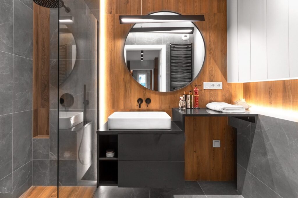 Wnętrze łazienki kontynuuje elegancki wymiar pozostałych pomieszczeń: armatura, grzejnik i dodatki w kolorze czarnym prezentują się niesamowicie w połączeniu z szarością i drewnem, a LEDowe oświetlenie mebli wykonanych na wymiar i okrągłe lustro prezentują się bardzo atrakcyjnie.