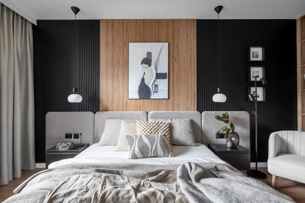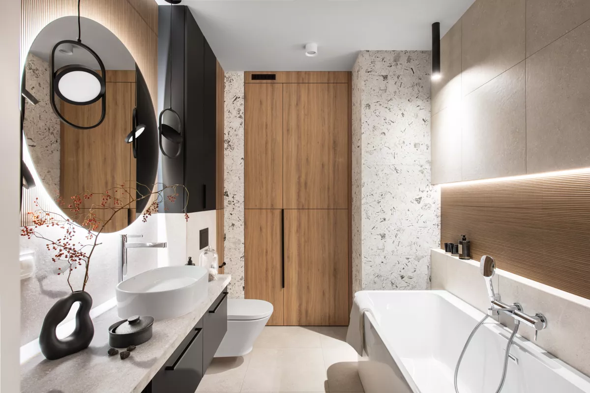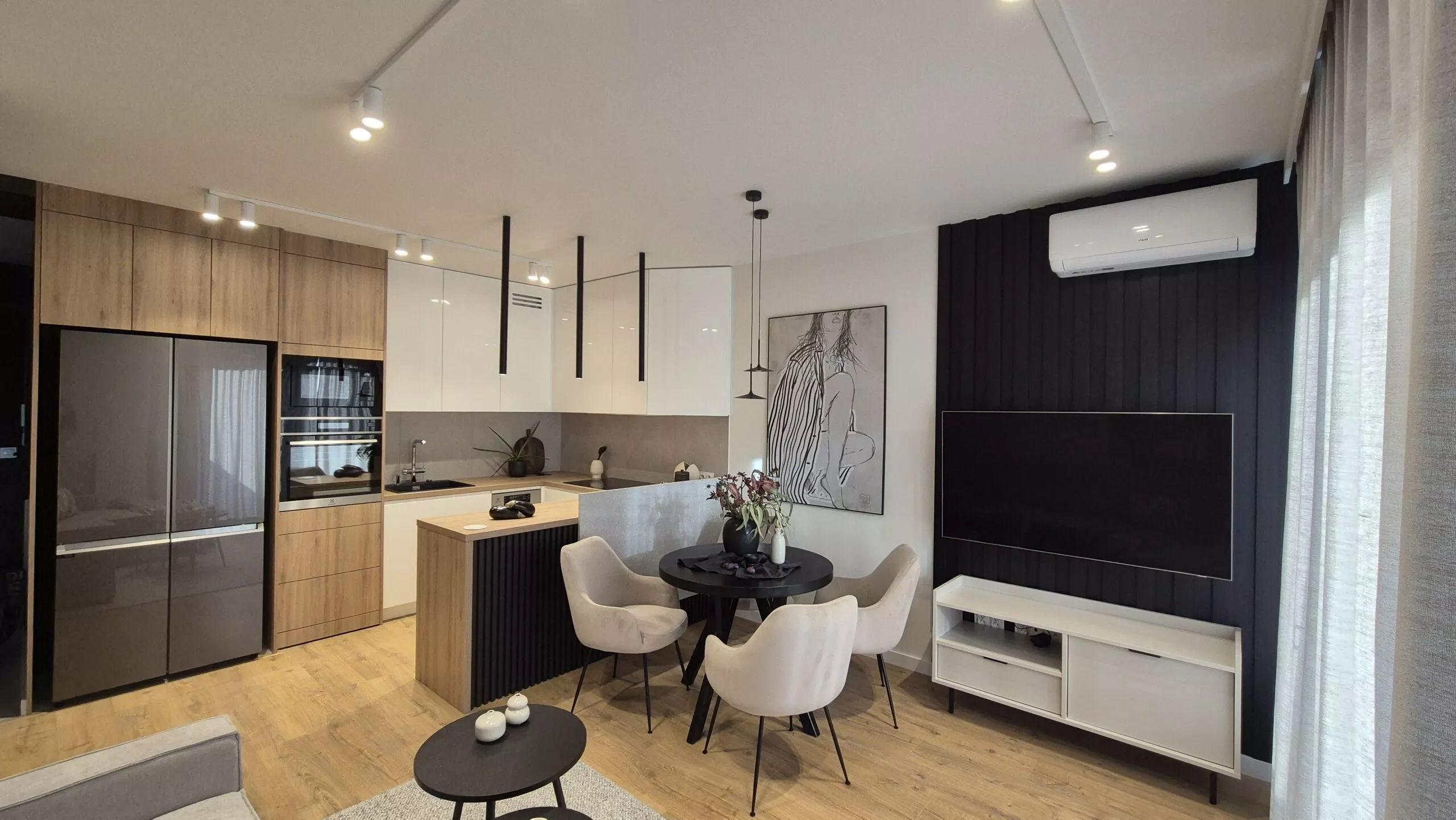 W prezentowanym apartamencie dominują ciemniejsze odcienie drewna, które idealnie komponują się z kontrastującą grą bieli i czerni, tworząc elegancką, ale jednocześnie ponadczasową aranżację wnętrza. To gustowne połączenie kolorów nadaje przestrzeni nowoczesny, ale przytulny charakter, który będzie cieszył oko przez wiele lat. Wystrój wnętrza został zaprojektowany z myślą o praktycznym, codziennym użytkowaniu, ale również o estetyce, która zachwyca.