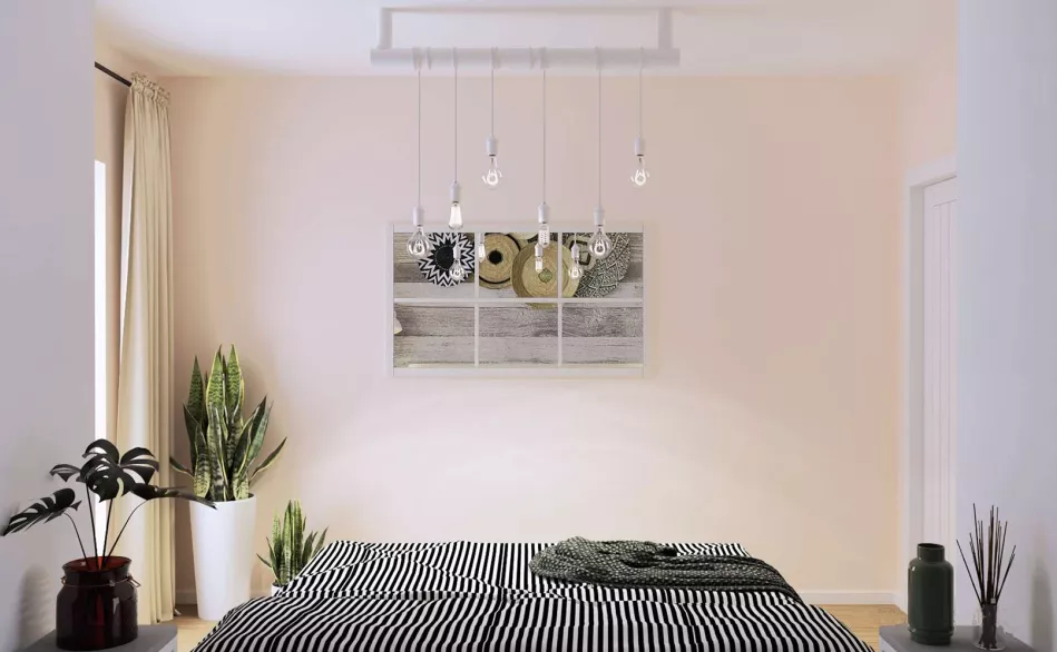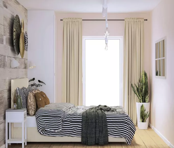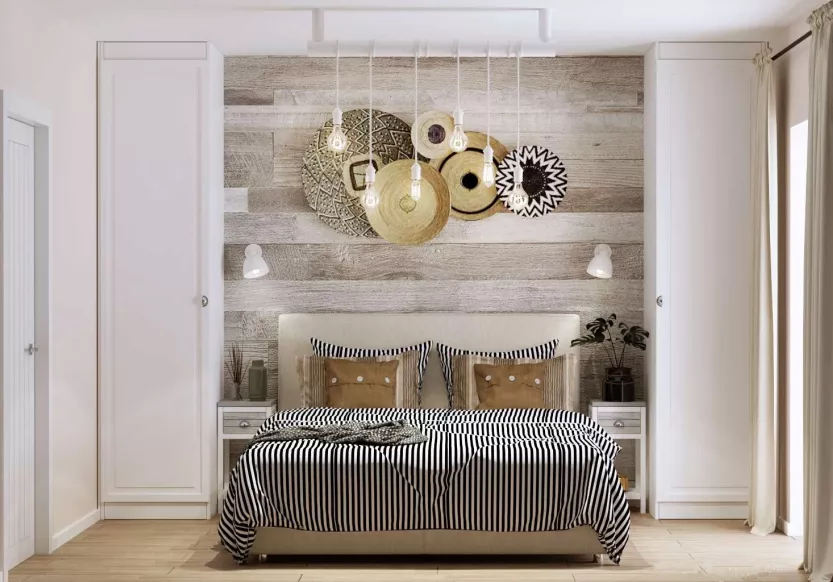 W sypialni spotykamy się z mieszkanką stylów boho i rustykalnego. Kontynuowana paleta kolorystyczna nadaje wnętrzom ciepła i przytulności. Co więcej, na odbiór całego pomieszczenia wpływa zastosowanie dekoracyjnej deski na ścianę. Sypialnia, zupełnie jak całe mieszkanie, prezentuje się fantastycznie!
