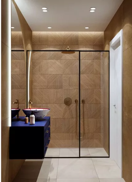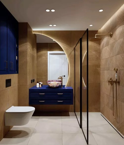 Kolorystyczną kontynuację zabudowy kuchennej znajdujemy w pięknej łazience. Tutaj również pojawia się kwiecisty motyw w postaci umywalki nablatowej. Warto zwrócić uwagę na oryginalny wzór płytek, podwieszany sufit i walk-in z czarną ramą. Złota armatura i zastosowanie nieszablonowego lustra z oświetleniem sprawiają, że pomieszczenie nabiera eleganckiego, acz lekkiego charakteru.