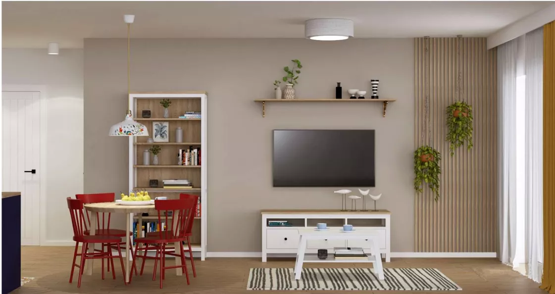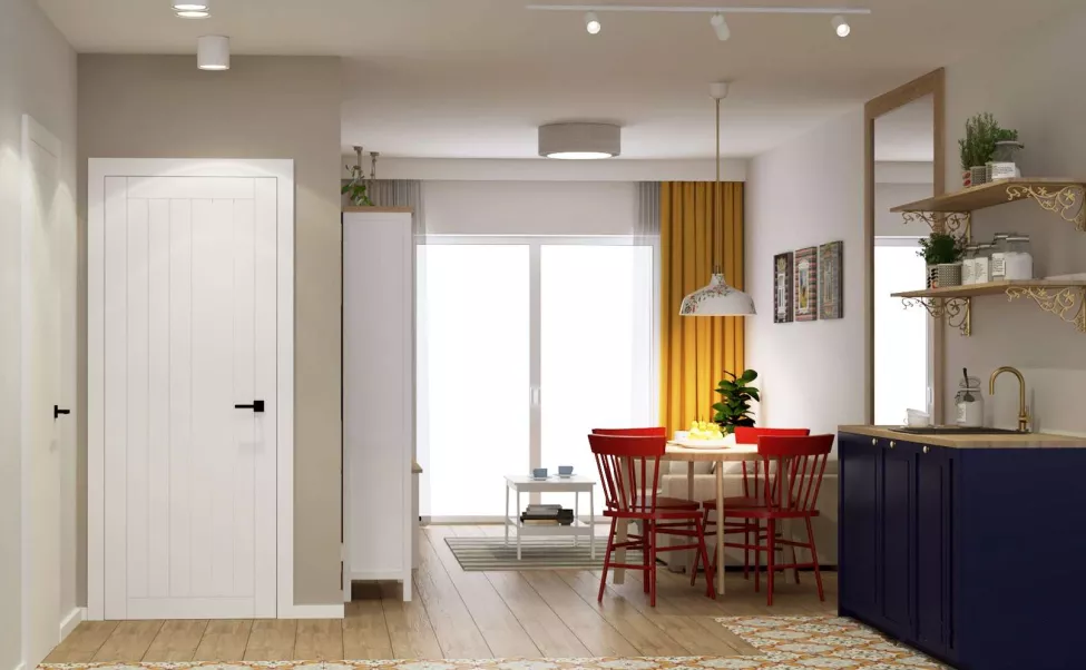 Poniżej prezentujemy galerię wizualizacji kolejnego mieszkania. Prace niebawem dobiegną końca i oddane wnętrze będzie gotowe do zamieszkania. Dwupokojowe mieszkanie zlokalizowane jest w okolicach krakowskiej Olszy i składa się z salonu z kuchennym aneksem, osobnej sypialni, łazienki i przedpokoju. Mieszkanie zaprojektowano w duchu modnego stylu boho, który łączy w sobie naturalność i egzotykę z eklektyzmem i elementami etnicznymi. Dlatego kolory i kwieciste wzory są obecne w całym mieszkaniu. Zastosowanie pełnowymiarowego lustra w salonie sprawia, że pomieszczenie jest większe optycznie. Czerwone krzesła w oryginalny sposób przełamują stonowaną paletę kolorystyczną. Takie detale jak makramowe kwietniki, drewniane lamele czy wisząca lampa z kwiecistym wzorem składają się na folklorystyczny charakter salonu.