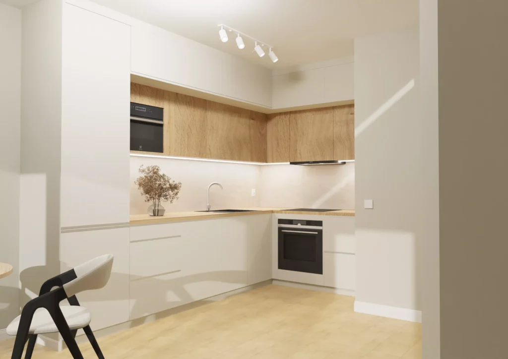 Wykończone przez SaniWell mieszkanie składa się z salonu, aneksu kuchennego, dwóch sypialni oraz osobnej garderoby, co zapewnia maksymalną wygodę. Przestrzeń zaplanowano tak, aby stanowiła komfortowe miejsce do odpoczynku, pracy jak również spotkań z bliskimi. Prace wykończeniowe przeprowadzono w ramach Pakietu „Komfort”, który obejmuje szeroki wybór materiałów. Co więcej, klient mógł również skorzystać z dodatkowych opcji wykraczających poza podstawowy pakiet. Dzięki elastyczności pakietów wnętrze zostało dostosowane do indywidualnych potrzeb, a każdy etap – od planowania po montaż – wykonano z najwyższą starannością przez zespół SaniWell. Dlatego w projekcie Osiedle Bonarka zaprojektowano, a następnie wykonano przez naszych stolarzy zabudowę kuchenną i garderobę.