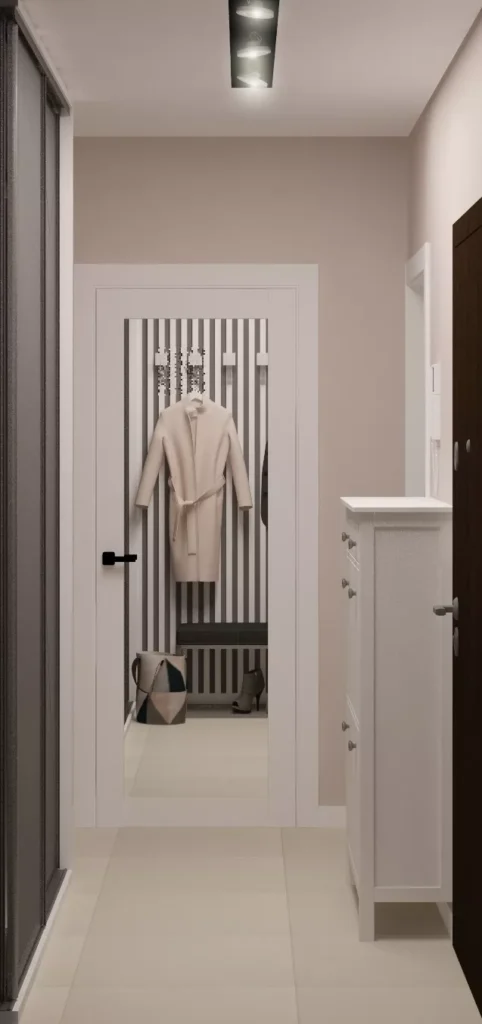 W hallu zastosowano oświetlenie chowane w sufit oraz pojemną szafę wykonywaną na wymiar zgodnie z projektem. Co więcej, zastosowanie przeszkleń, chowanego oświetlenia i lekkich lameli dekoracyjnych miało na celu optyczne zwiększenie przedpokoju.