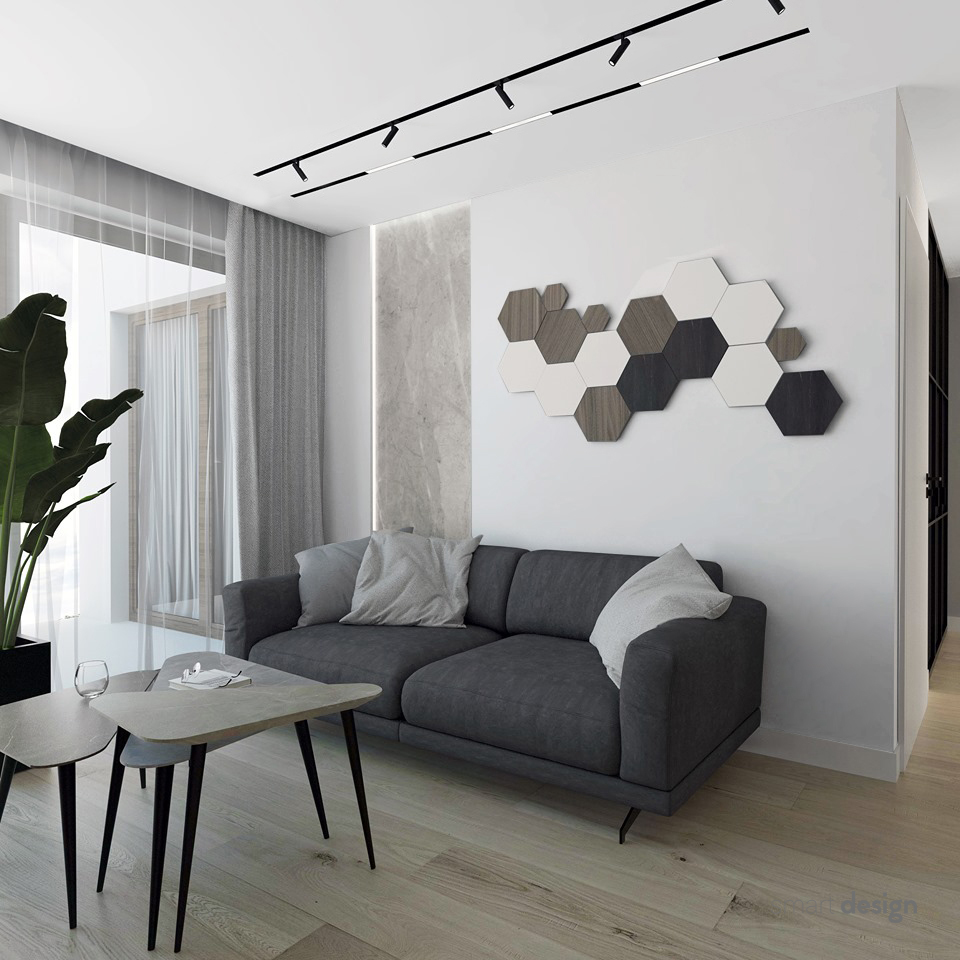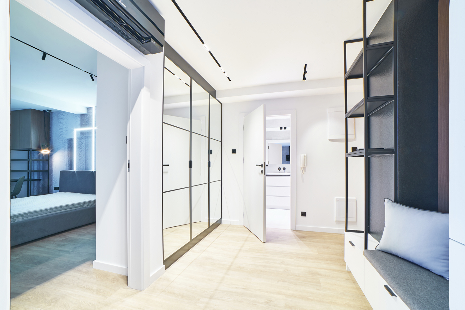 W prezentowanym mieszkaniu zastosowaliśmy wielkoformatowe spieki kwarcowe, specjalna winylową podłogę na podłożu korkowym, wypalany grafitowy blat, meble w okleinie naturalnej i lakierze. Klimatyzację, chowane w sufit oświetlenie i ogrzewanie wnętrza spięliśmy w jeden spójny system inteligentnego domu sterowany przez firmę Grenton. Wszystkie zastosowane rozwiązania sprawiają, że mieszkanie należy do najefektywniejszych i zarazem najdroższych, jakie wykonywaliśmy.