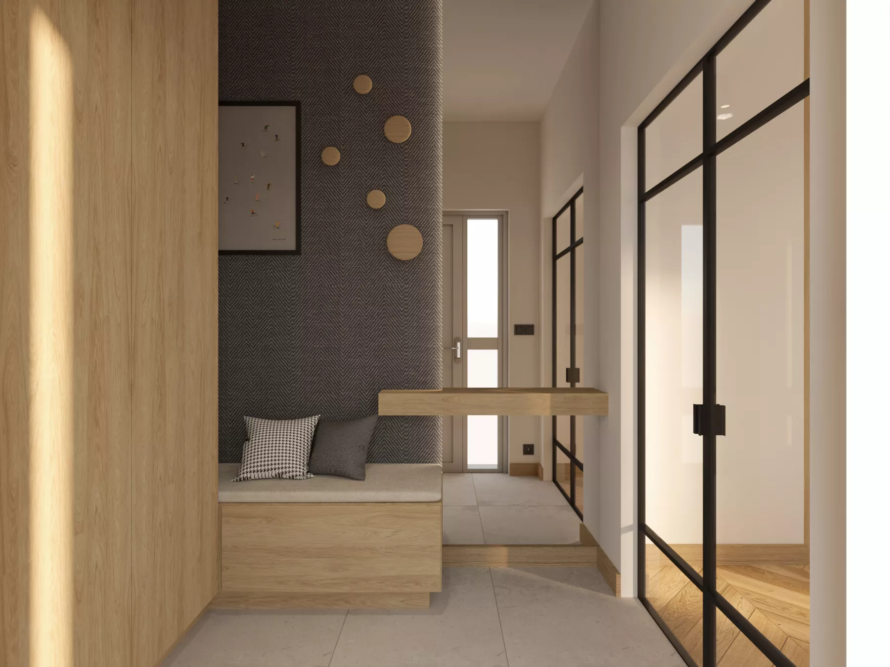 Mieszkanie wyróżnia się przestronnym układem, który zapewnia komfort użytkownikom. Serce mieszkania stanowi salon z aneksem kuchennym, gdzie funkcjonalność spotyka się z estetyką. Ciemna zabudowa kuchni kontrastuje z jasnymi frontami mebli, tworząc elegancki efekt wizualny. Ustawny korytarz łączy wszystkie pomieszczenia, umożliwiając swobodne poruszanie się. W głównej sypialni stworzono miejsce do pracy, co sprawia, że przestrzeń jest nie tylko przytulna, ale również praktyczna.