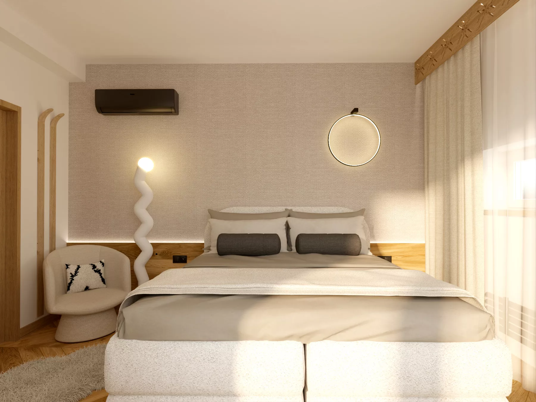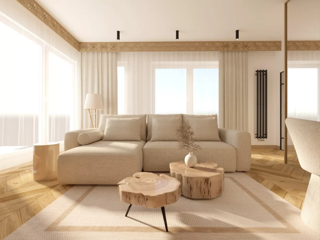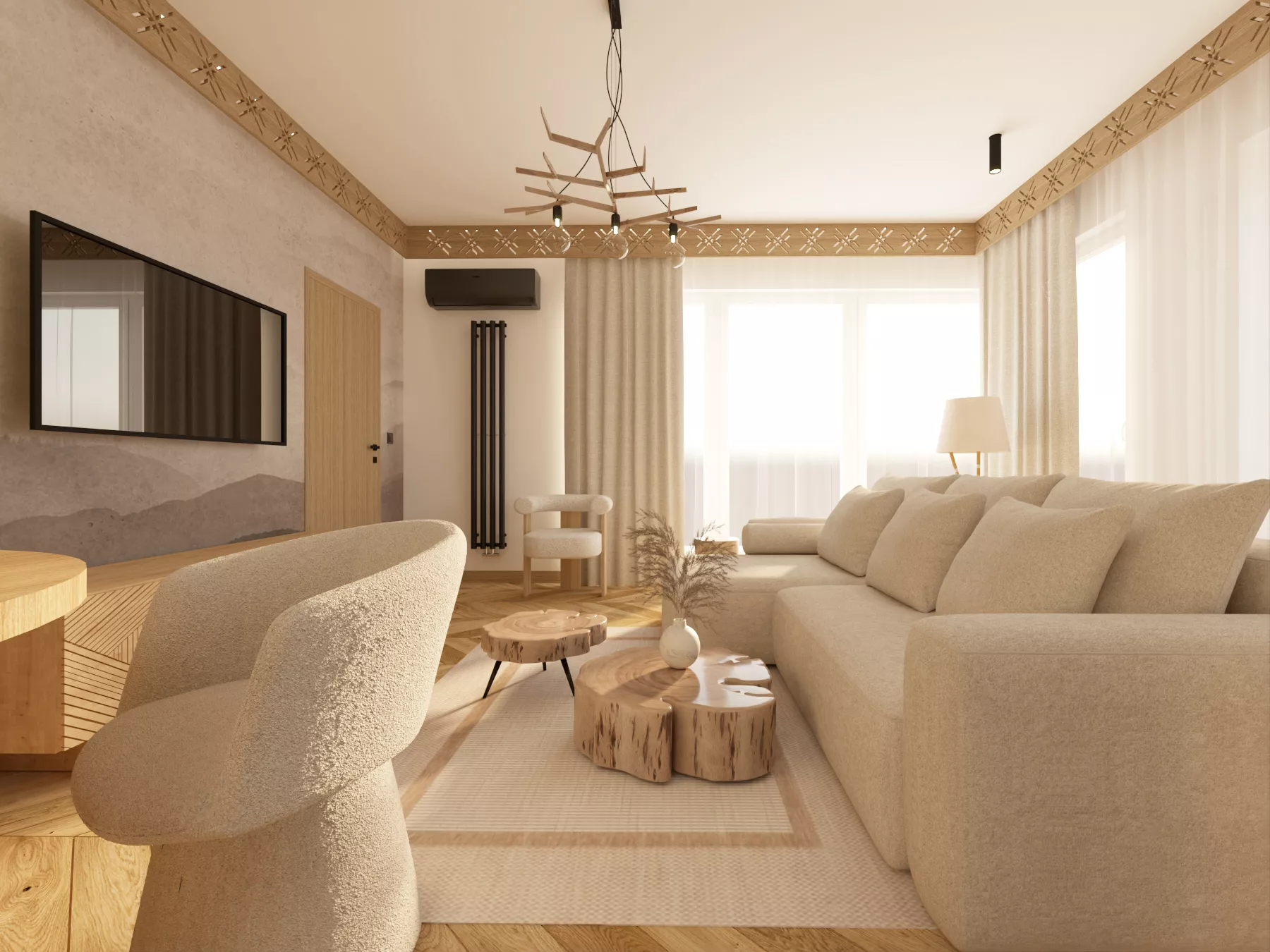 Dominujące kolory to odcienie beżu, bieli oraz naturalnego drewna, które wprowadzają harmonię i ciepło. W salonie zastosowano tapetę z delikatnym pejzażem, która dodaje wnętrzu charakteru i subtelności. Sypialnie oraz łazienki zachwycają dekoracyjnym wykończeniem ścian i starannie dobranym oświetleniem. Wykorzystanie elementów hygge i boho nadaje wnętrzu przyjazny klimat, sprzyjający relaksowi.