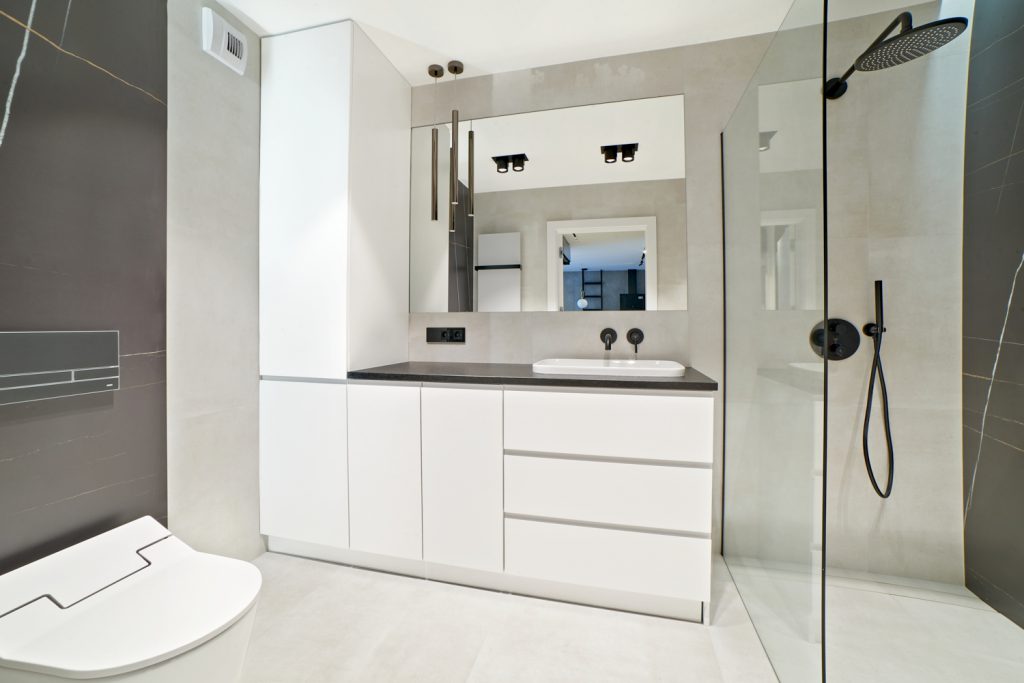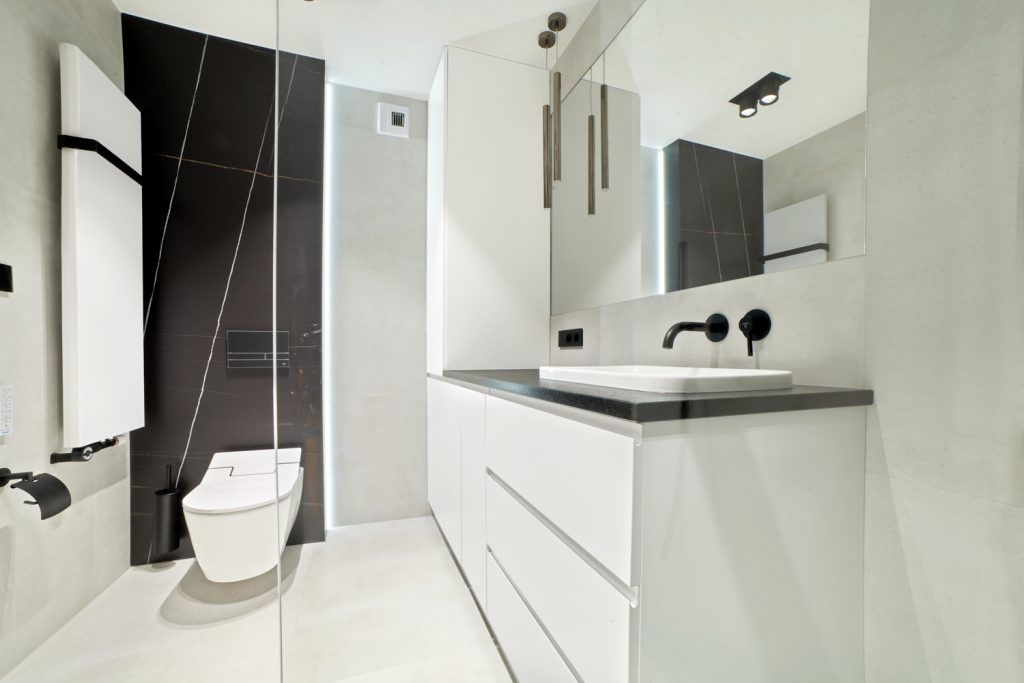 W realizacji SaniWell – Projekt Ruczaj – spiekami kwarcowymi została wykończona m.in.: łazienka. W tym zabudowa stelaża WC oraz ściana we wnęce Walk-in. Spieki pojawiają się również w dekoracyjnej formie w salonie.