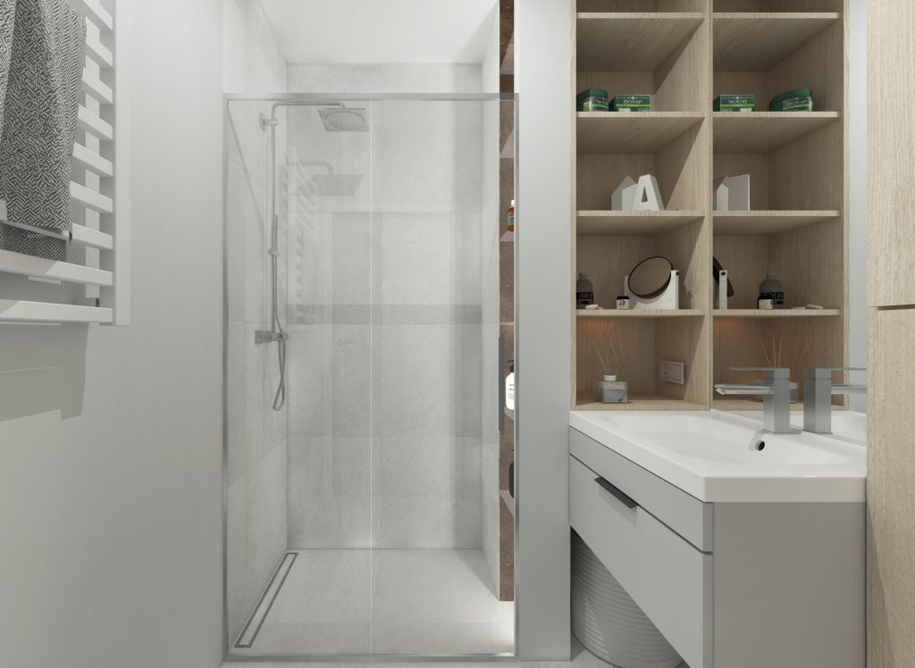 Aranżując wnętrze, należy pamiętać o doborze mebli łazienkowych, które zapewnią miejsce do przechowywania sprzętów i wyposażenia. Należy również pamiętać, aby zachować właściwe i bezpieczne odległości pomiędzy poszczególnymi sanitariatami.